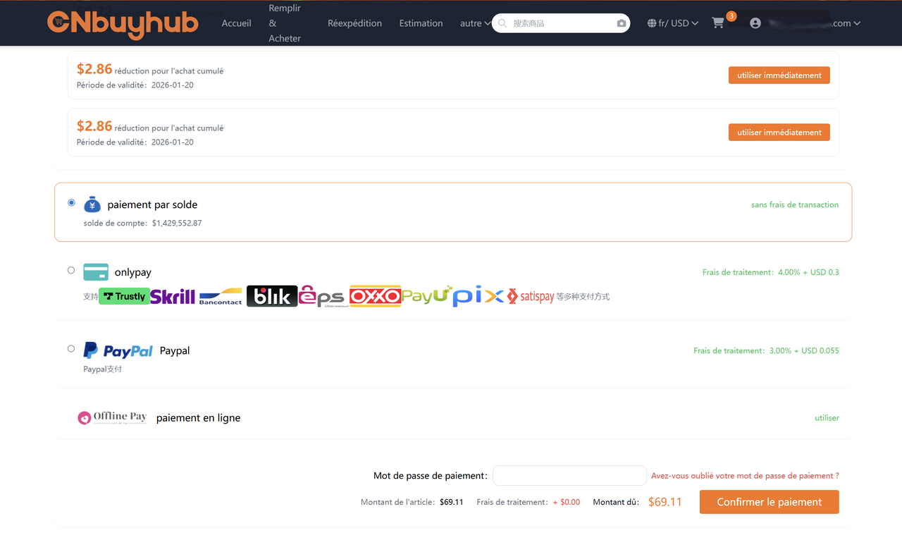 Choisissez votre méthode de paiement et payez le prix du produit ainsi que les frais de livraison depuis la Chine continentale.